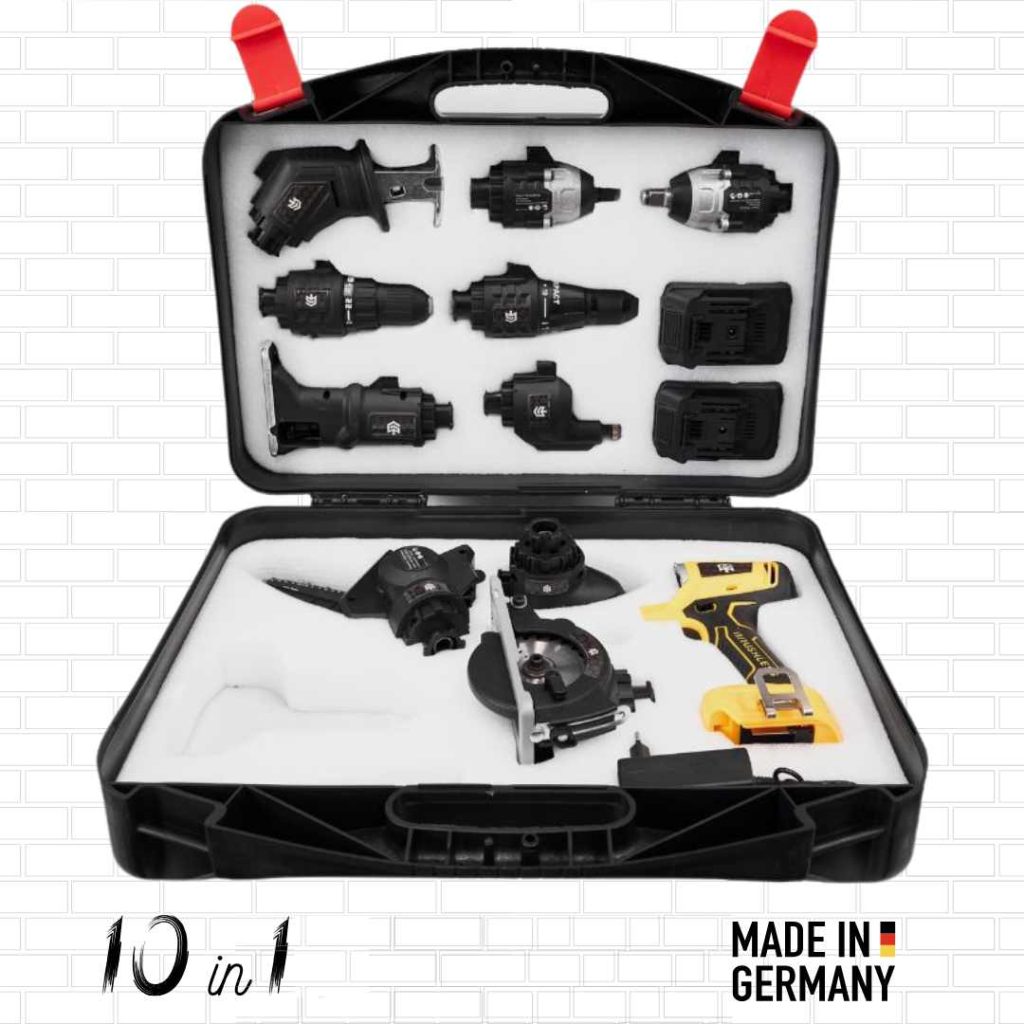 Wszystko w zestawie: korpus urządzenia, 10 funkcji, 2×4Ah, ładowarka i walizka. Załóż końcówkę, włącz, pracuj. Prosto, szybko, wygodnie: idealne do natychmiastowych i bezproblemowych prac.