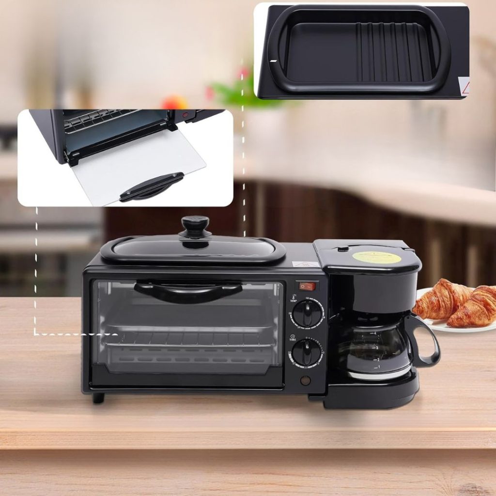 Toto zařízení kombinuje tři domácí spotřebiče v jednom: nepřilnavou plotnu na smažení nebo ohřívání, 9litrovou elektrickou troubu a varnou konvici na americkou kávu nebo bylinkový čaj.