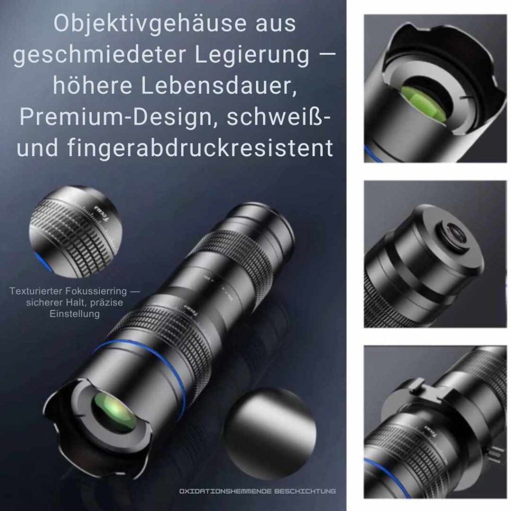 Im Unterschied zum digitalen Zoom, der das Bild verpixeln würde, hast du hier echte Optik, gefertigt aus Materialien in Profi-Fotoqualität.