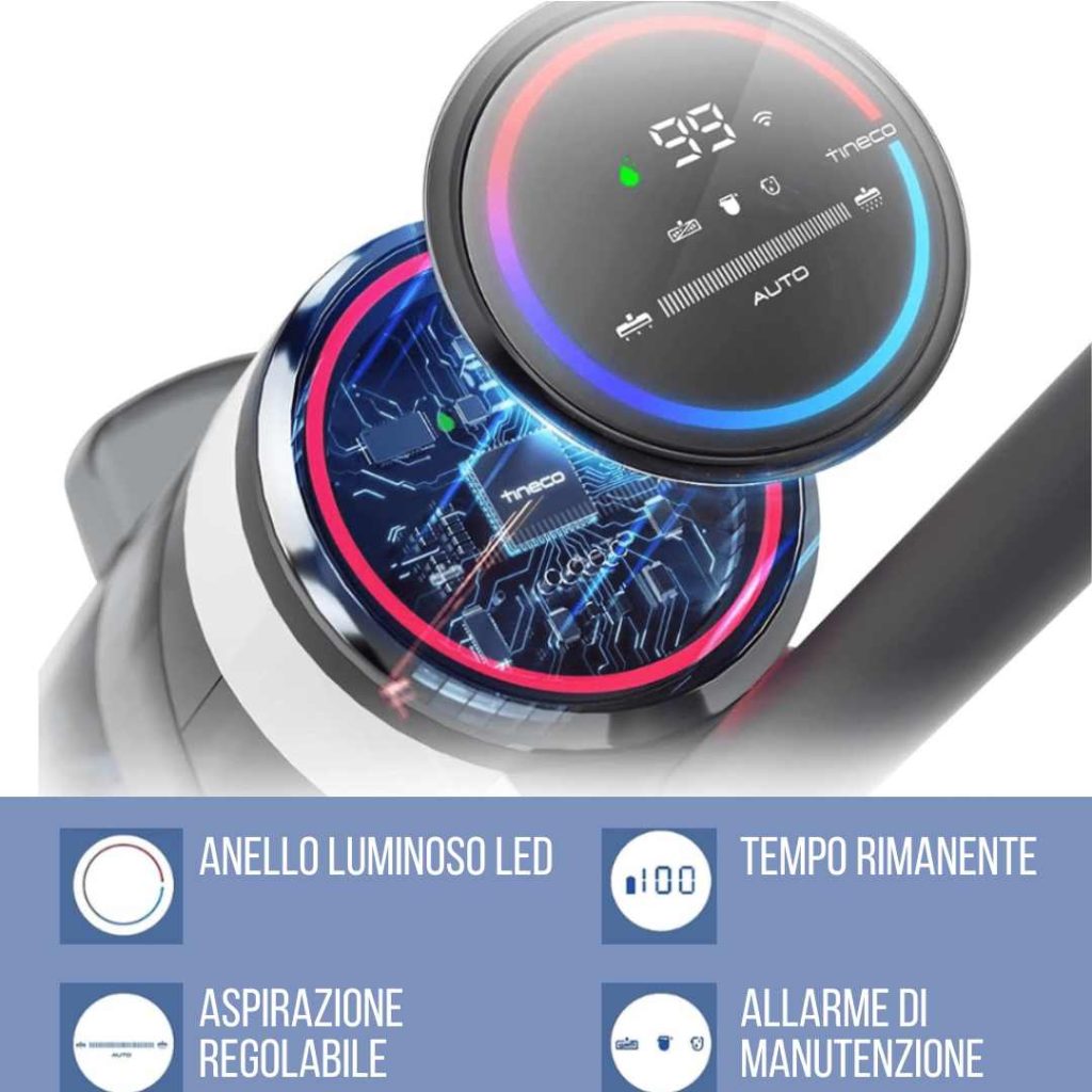 Lo schermo LCD integrato ti mostra in tempo reale lo stato della pulizia, il livello di sporco rilevato e la carica residua. Il sensore automatico regola la potenza in base alla quantità di polvere: massima efficienza, zero sprechi.